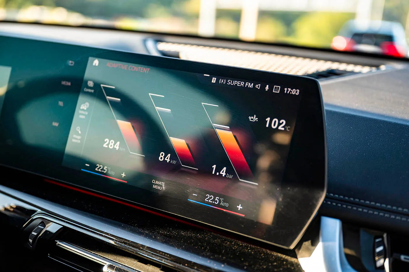 Isti utisak ostavlja i enterijer. Kabini ni ranije nije manjkalo kvaliteta, ali je sada to podignuto na viši nivo. Svi materijali su pažljivo odabrani i perfektno stilski uklopljeni, a uz to ni završna obrada ne ostavlja mesta bilo kakvim polemikama. Instrument-tabla (10.25 inča) i centralni displej (10.7 inča) jesu dva zasebna ekrana, ali su spojena u jedno kućište, koje je zakrivljeno tako da središnji monitor bude orijentisan ka vozaču. Ovo rešenje je debitovalo u prestižnom električnom „BMW-u iX”, a implementirano je između ostalog i kod restilizovane „serije 3”. Takođe iz „iX” je preuzeta lebdeća ploča, koja se naslanja na središnji naslon za ruke. Na njoj su poređane važne komande kao što su taster automatskog menjača, birač modova vožnje, električna ručna kočnica, a sa desne strane suvozaču su na raspolaganju osnovne funkcije audio-sistema.