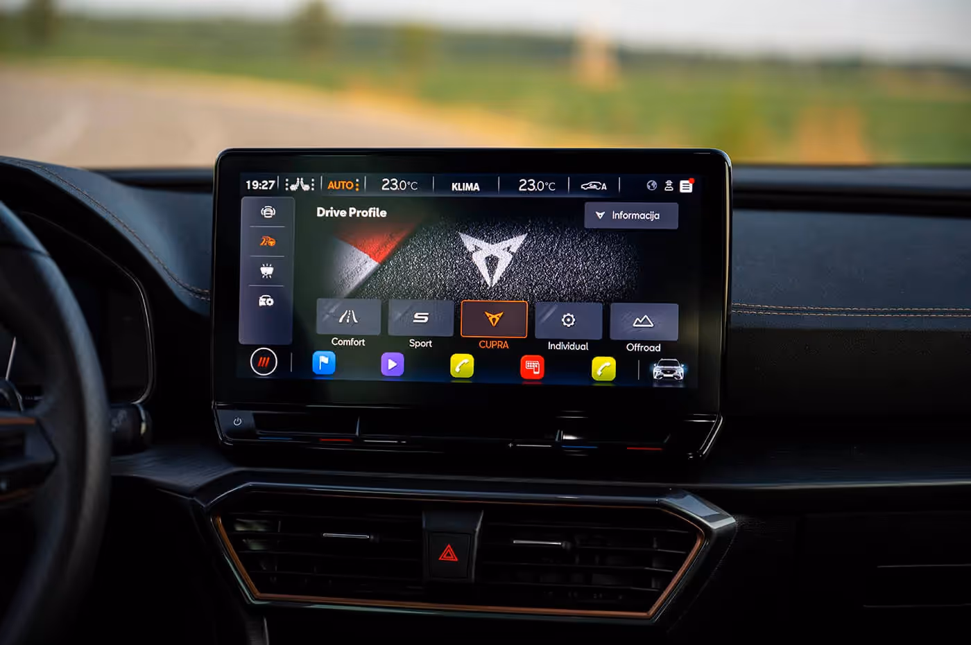 Ta mustra je prenesena i u enterijer gde dominiraju integralna, sportski profilisana sedišta presvučena kožom. Nekih drugih autentičnih detalja gotovo i da nema, ali je i to sasvim dovoljno da se stekne utisak boravka u jednom kvalitetnom i dobro stilizovanom ambijentu. Tome doprinosi i digitalizacija, atraktivno ambijentalno osvetljenje u više boja, kao i par ekrana. Jedan od njih je u službi instrument-table, a drugi za pristup različitim informacijama i funkcijama – od navigacije, zabave, do podešavanja klima-uređaja i modova vožnje. Odlična grafika i brz interfejs čine dopadljivim Kuprin multimedijalni sistem, ali stoji zamerka da za neke opcije klima-uređaja, one koje se inače koriste često, takoreći na svakodnevnom nivou, mora duboko „zaroniti” u nekoliko menija ispod površine. Srećom, podešavanje temperature je na dodir od vozača i suvozača, ali površine osetljive na dodir za kontrolu tih funkcija nisu baš intuitivne na dodir, pa sve to traži izvestan period navikavanja.