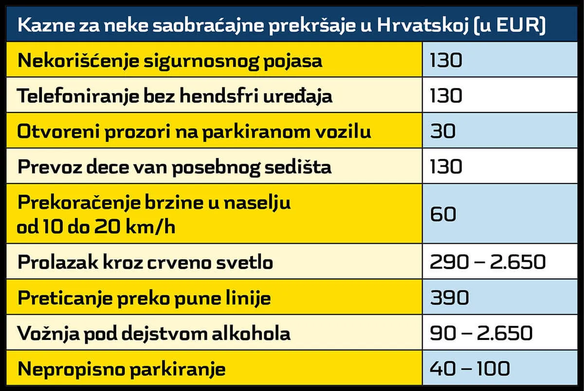 Zanimljivo je da u Hrvatskoj ne smete ostaviti otvorene prozore na parkiranom vozilu. Naime, tamošnji zakon kaže da tako omogućavate da neko neovlašćeno pokrene vozilo i izazove nezgodu. Ova neopreznost vas može koštati 30 evra. To doduše nije novina, jer slične propise imaju i Italijani i neke druge zemlje Evropske unije. Druga stvar koju bi trebalo imati na umu jeste da po svaku cenu izbegnete vožnju „na braniku”, odnosno – morate imati dovoljno bezbedno odstojanje od vozila ispred vas. Za to je najbolje koristiti čuvenu formulu dve sekunde – uzmete neki marker, na primer znak ili drvo, i kad automobil pre vas prođe pored njega počnite sa brojanjem. Ako ste vi došli do markera nakon više od dve sekunde, onda imate dovoljno odstojanje. U suprotnom može vam se dogoditi da platite kaznu od 70 evra.