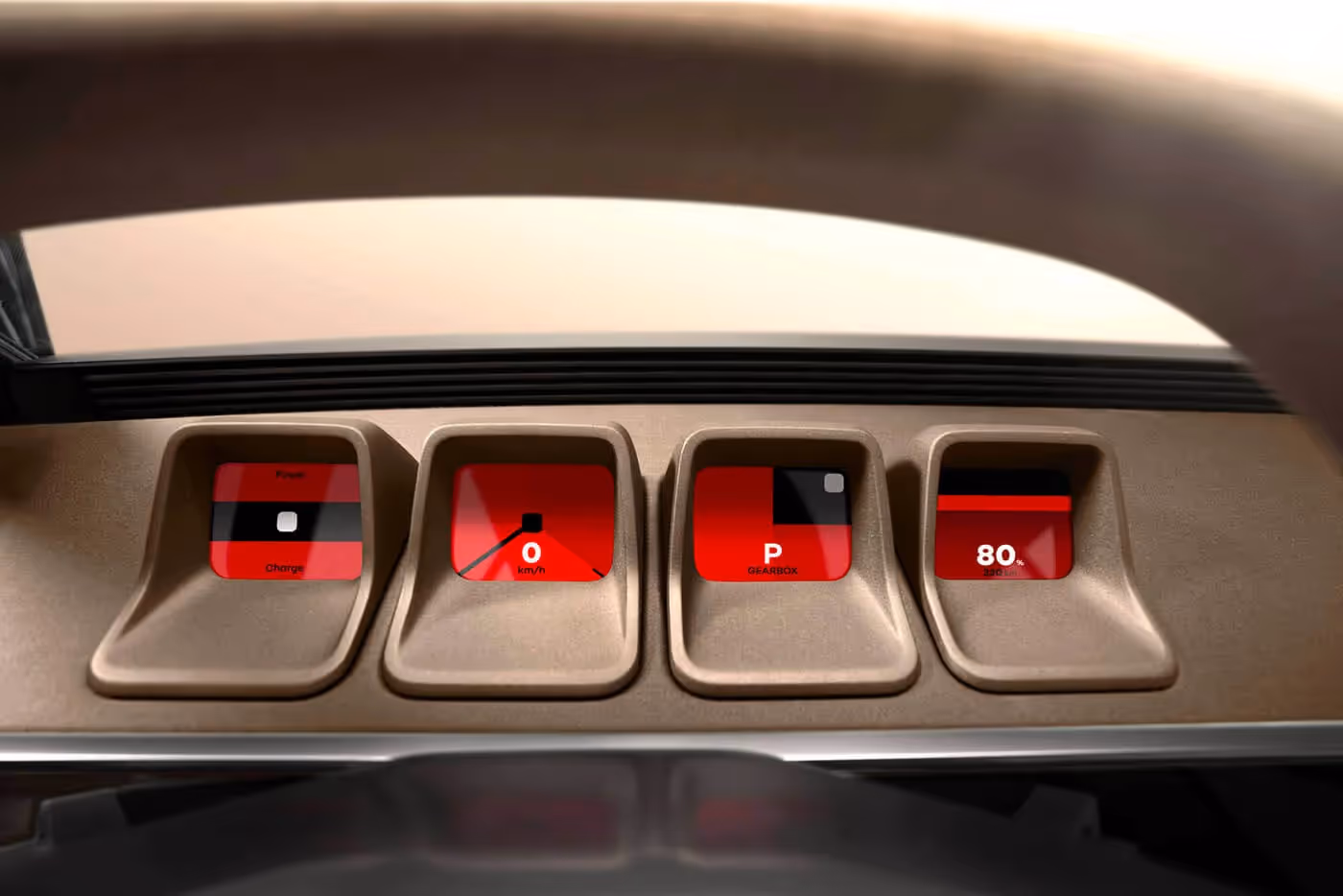 Kokpit je s izrazitim ukusom 1970-ih, ukrašen smeđom i bež bojom i sa svim ekranima smeštenim u retro kućištima na vrhu minimalističke table s instrumentima.