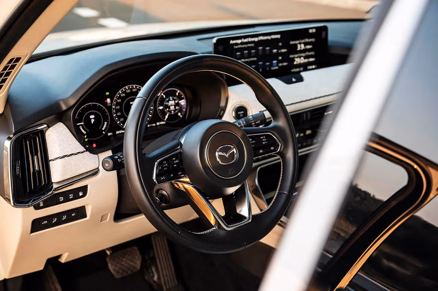 U pogledu digitalizacije Mazda nastupa oprezno, možda i suviše ziheraški. Centralni ekran je diskretno postavljen i neobičnih je proporcija – širok i nizak, i još uvek ne nudi mogućnost taktilnih komandi, pa tako, na primer, unošenje adrese u navigaciju zahteva više vremena, jer se služite rotacionim kontrolerom. Pored njega se nalaze tasteri – prečice za glavne sekcije multimedijalnog sistema. Sa druge strane, zadržavanje klasičnih tastera, poput onih za klimatizaciju, rukovanje čine lakšim u poređenju sa „tač skrin” inputima. Instrument-tabla jeste digitalna i opskrbljuje vozača dovoljnom količinom informacija istovremeno, ali se ne ističe nekom interesantnom i maštovitom grafikom. Utisak je da su u Mazdi nastojali da proizvedu efekat kvaliteta i luksuza u jednom umirujućem i nadasve elegantnom ambijentu.