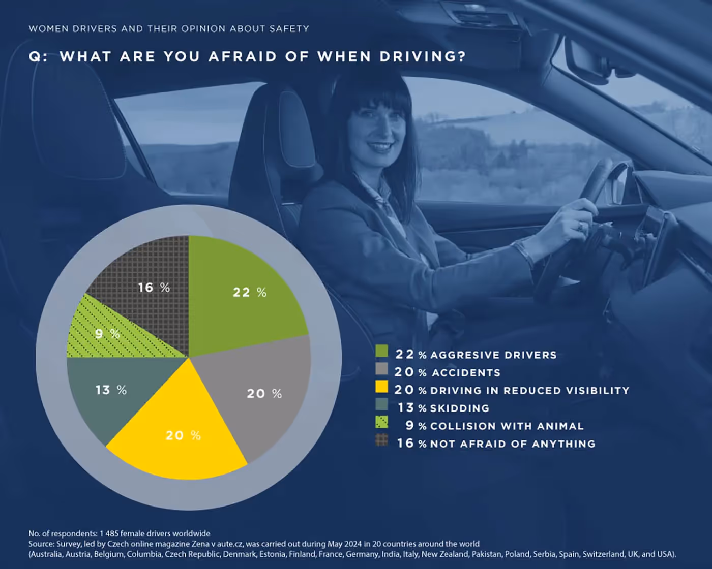 Prema studiji, postoje tri glavne teme oko kojih su žene vozači zabrinute: agresivni vozači (22%), saobraćajne nezgode (20%) i vožnja pri smanjenoj vidljivosti (20%). Zatim slede proklizavanje vozila (13%) i sudar sa životinjama (9%). Sa druge strane, 16% žena vozača ne plaši se ničega.