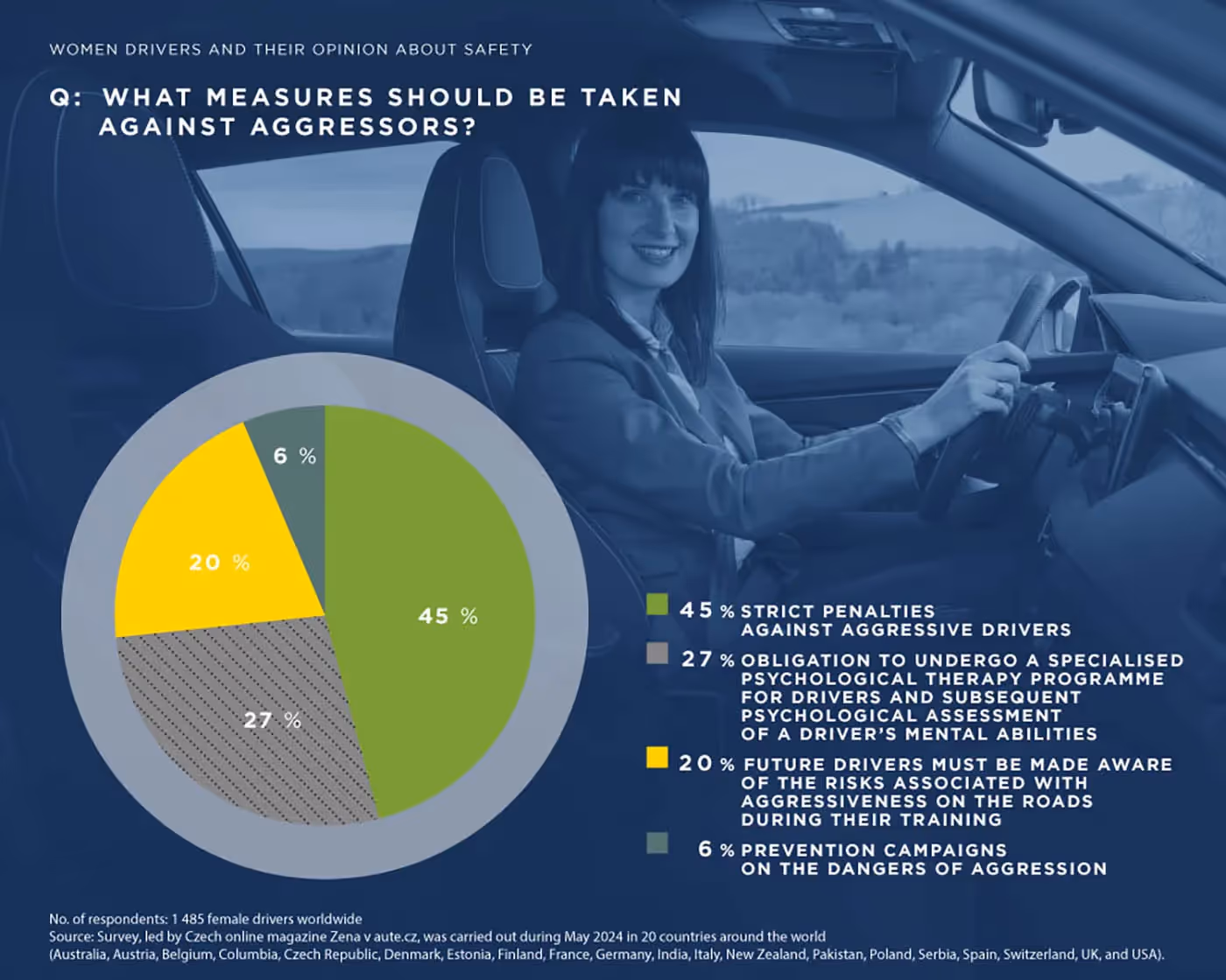 Na pitanje koje mere treba preduzeti protiv agresivnih vozača, žene vozači širom sveta uglavnom predlažu strože kazne (45%), program specijalizovane psihološke terapije (27%), detaljniju obuku budućih vozača (20%) i preventivne kampanje (8%).