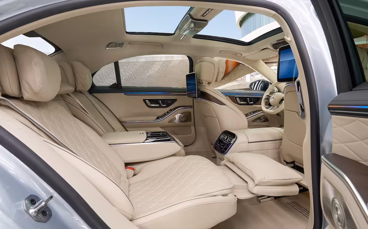 Materijali su najfiniji, pa kabinom dominira prirodna koža koja stvara svojevrsnu oazu luksuza. Prvoklasno poslovno iskustvo na zadnjim sedištima omogućuje liderska ponuda prostora koju prati MBUX High-End Rear Seat Entertainment s dvostrukim 13,1-inčnim ekranima i tandemom MBUX daljinskih upravljača. Mercedes navodi da ti elementi kabinu pretvaraju u potpuno povezano radno mesto ili mirno utočište.