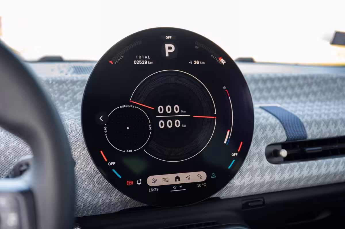 Najdominantniji element je centralni kružni OLED ekran koji ne samo da prikazuje informacije, već praktično zamenjuje klasičnu instrument tablu, infotaiment i veliki deo fizičkih komandi. Rezolucija i kontrast su takvi da je čitljivost odlična u svim uslovima, dok je reakcija sistema dovoljno brza da interakcija deluje prirodno, gotovo kao kod pametnog telefona.