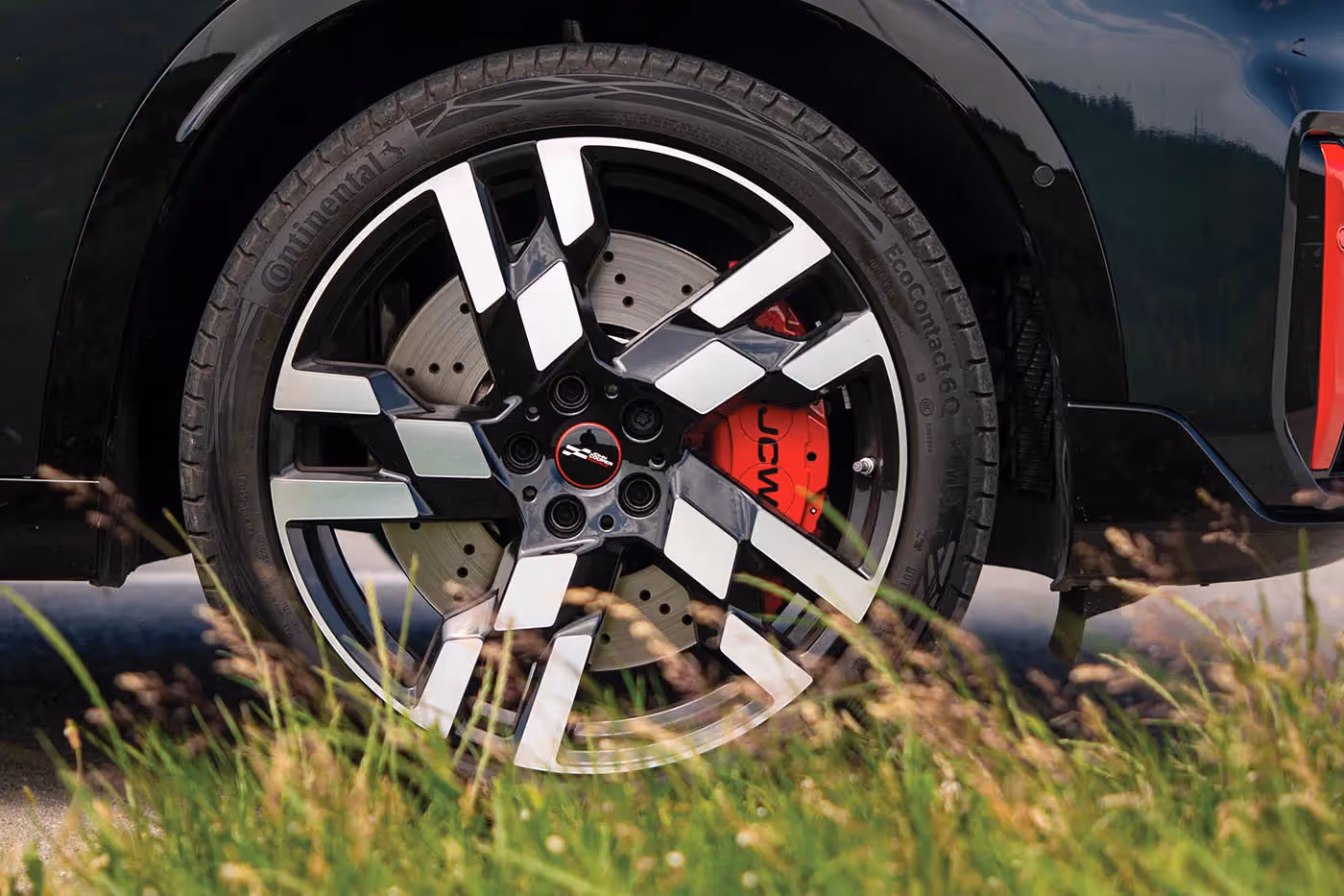 I zaista godi što prvi ukus novog „kantrimena” dobijamo od top verzije sa potpisom John Cooper Works. Čudnovat izgled ovog modela još više dolazi do izražaja kada je njegova neobična odora ukrašena atraktivnim dodacima koji predstavljaju pravi magnet za poglede. Specijalni aluminijumski točkovi od 20 inča iz limitirane serije, agresivnija maska sa većim uvodnicima vazduha, bočni pragovi, kao i završeci izduvnog sistema u topovskoj formaciji 2+2 na levoj, odnosno desnoj strani, dok je između njih uglavljen difuzor vazduha za jači „daunfors”, odnosno bolje prianjanje pomoću strujanja vazduha ispod poda automobila.