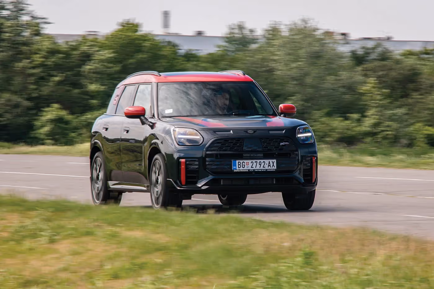Iako je u poređenju sa drugim SUV modelima i dalje na „lakim nogama”, svu svoju brzinu i žustrinu ne prenosi tako lako u zavoje. Upravljač je super-oštar, ali ne daje poslednju reč u preciznosti – što ga čini dobrim za brzu, tečnu vožnju, ali nije efikasan ako preterate sa ulaznom brzinom i morate da pravite naglu korekciju. „MINI JCW kantrimen” do „stotke” stiže takoreći u treptaju oka, za svega 5,4 sekunde, a munjevito prima gas u svakoj situaciji. Nevezano od vozačkog profila, pun potencijal je uvek dostupan u kraćem vremenskom intervalu preko leve tipke za promenu stepena prenosa. Potrebno je samo privući ka sebi i zadržati u tom položaju. Inače, trebalo bi reći da su poluge za ručnu promenu stepena prenosa prilično male i izrađene od ne baš ugledne plastike, koja se može naći i na nekim drugim mestima, što svakako ne priliči jednom premijum automobilu, pogotovo ako je njegova cena paprena. Posebne pohvale zaslužuje to što je „turbo rupa”, odnosno trenutak od kada date gas pa dok motor krene da ubrzava, ovde gotovo neprimetna. Zato je izuzetno primetno kako kočnice briljantno rade svoj deo posla – izrazito su efikasne i postojane pri kontinuiranim snažnim kočenjima.