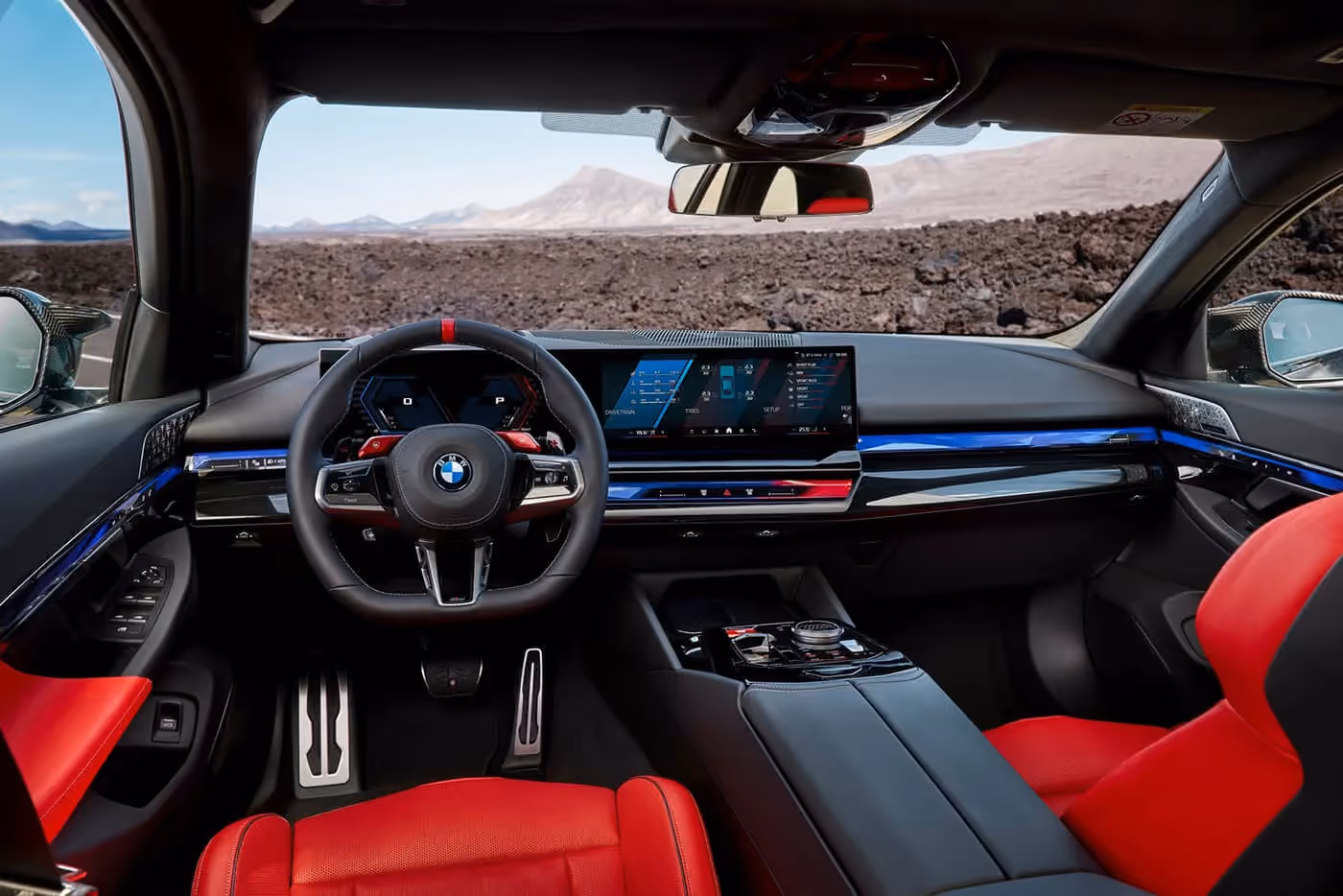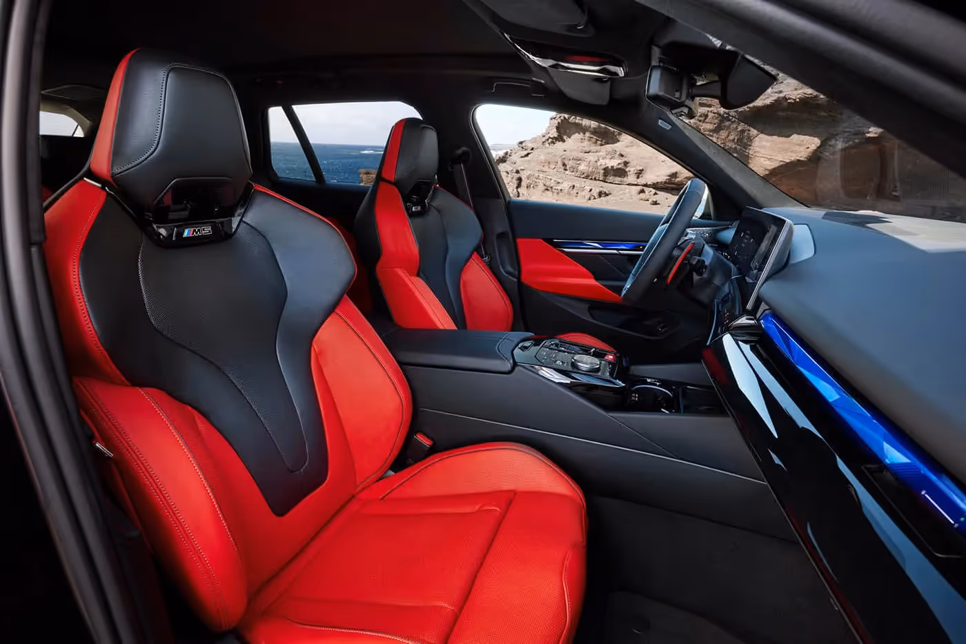 U kabini je kopija svog limuzinskog brata M5 sa školjka sedištima, ukrasima od karbonskih vlakana i BMW-ovim zakrivljenim ekranom sa unapređenim iDrive sistemom.