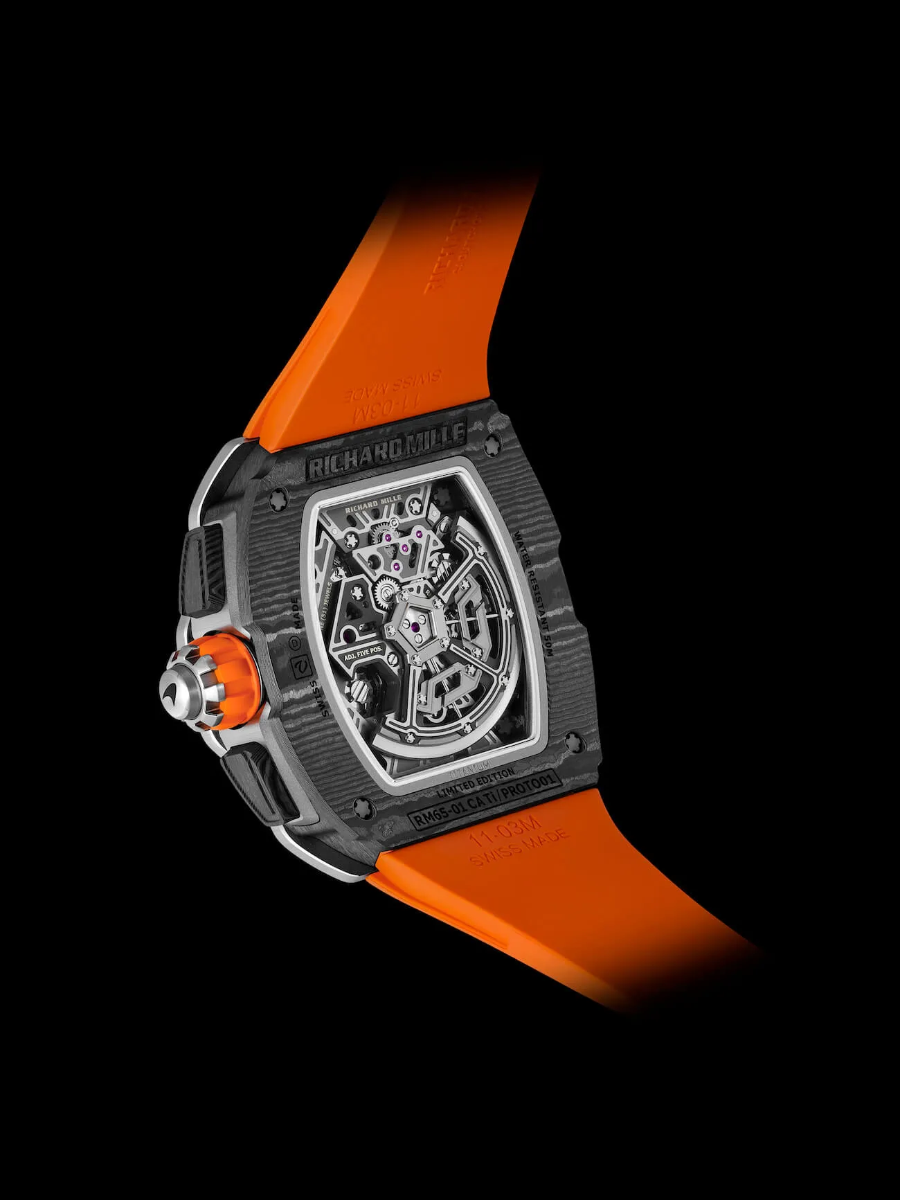 U maniru pravog vozačkog sata RM 65-01 McLaren W1 ima multifunkcionalnu krunicu koja pruža mogućnost odabira između tri različite funkcije: W je za navijanje, D za postavljanje datuma kod je H namenjeno za „ručno postavljanje”. Ergonomska krunica je izrađena od laganog titanijuma, koji je dodatno dekorisan detaljima u prepoznatljivoj papaja narandžastoj boji, nijansi McLaren automobila.