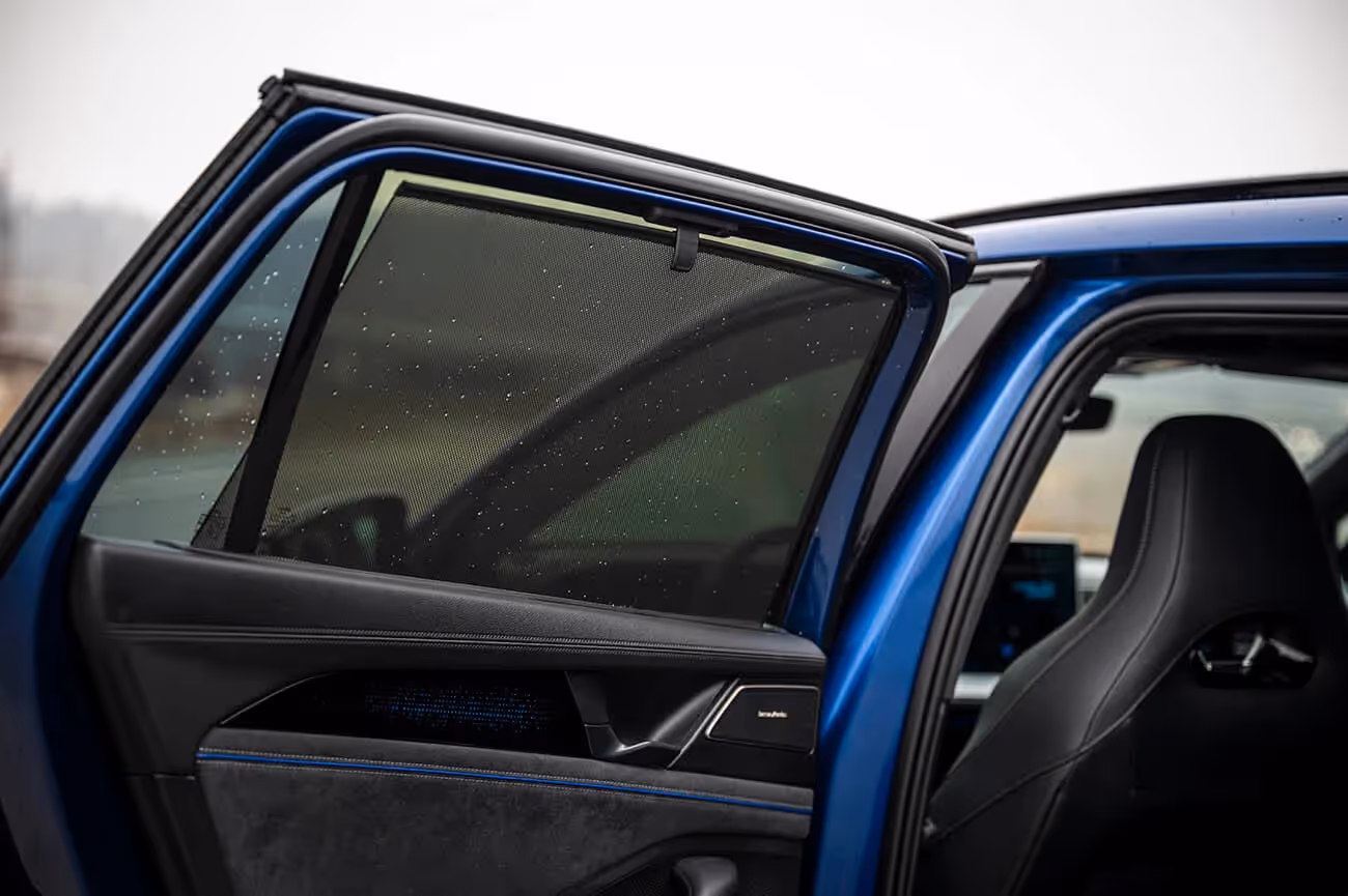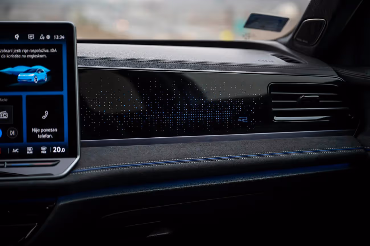Unutrašnjost je takođe obogaćena, pre svega sportskim R-line sedištima, natpisom R-Line u sklopu ambijentalnog osvetljenja koje sija ispred suvozača, a ugođaj pojačavaju i stavke koje se doplaćuju, poput staklenog panoramskog krova koji se otvara, velikog centralnog displeja od 15 inča (standard je 12,9 inča) sa Discover Pro Max navigacionim sistemom, hi-fi audio-sistem Harman Kardon izlazne snage čak 700 W, head-up displej itd.