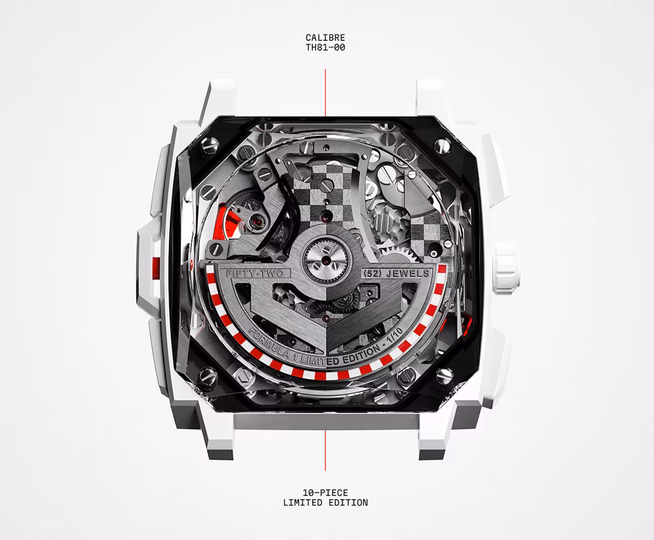 Kako bi naglasio veze sa svetom trka Tag Heuer je transparentni brojčanik obojio u prodornu crvenu nijansu. Ciferblat prestižnog noviteta raspolaže s tri hronografska podbrojčanika, pa TH omogućuje i merenje vremenskih deonica, uz Split-Seconds opciju. Centralnu poziciju zauzima i dvobojni znak kompanije, koji je vidljiv i na krunici. Stilski skladno, sat je povezan na beli kožni kaiš sa crvenim konstrastnim detaljima.
