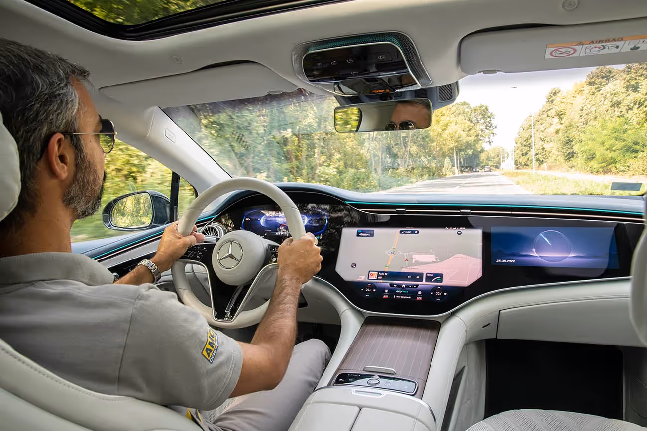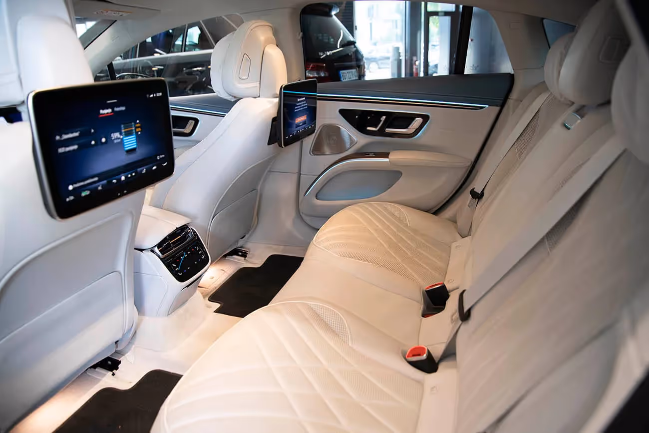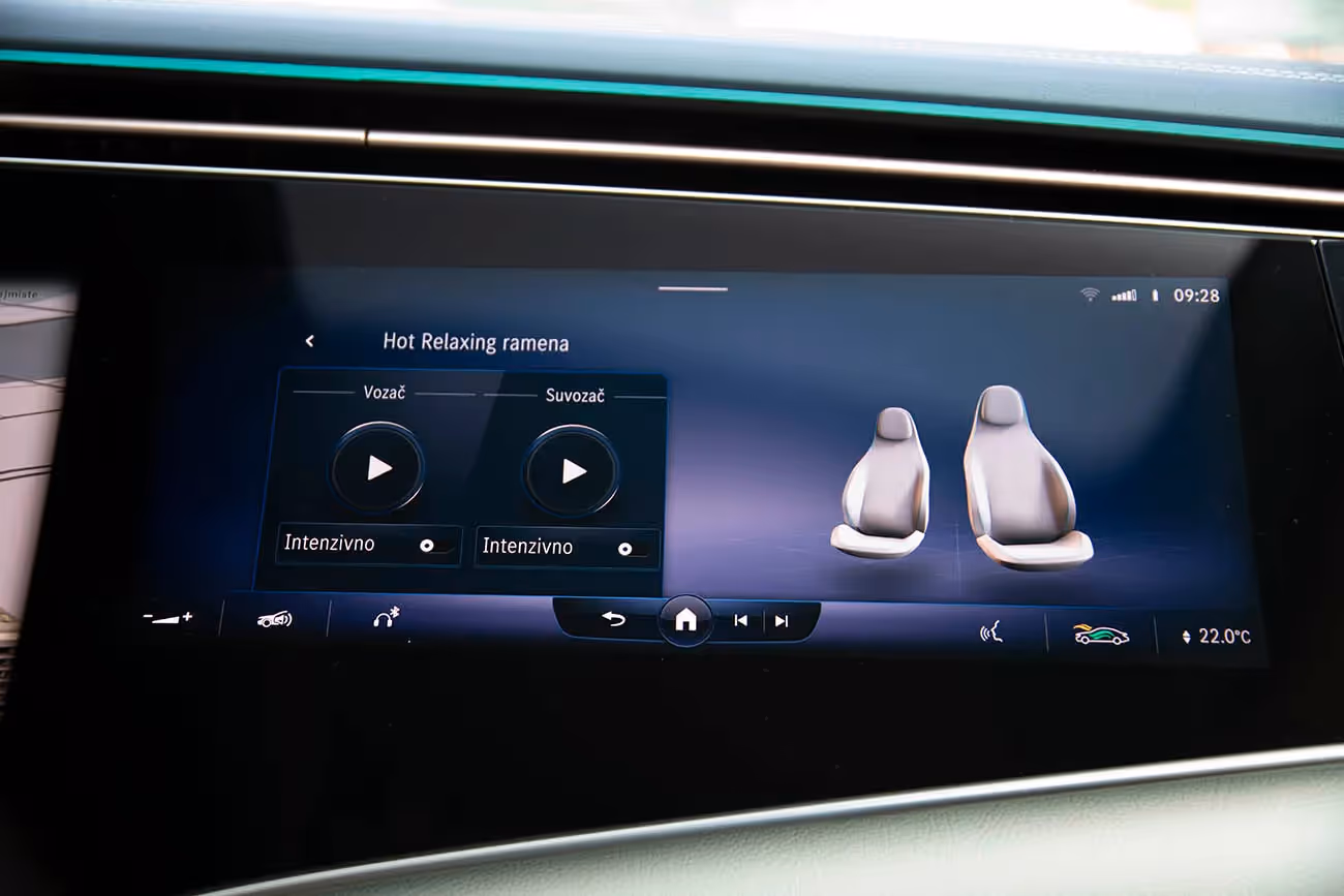 Kako smo se s ključem u džepu približili ovoj, po mnogo čemu, ekstravagantnoj limuzini, kvake su same iznikle iz vrata, kao svojevrstan znak da nam „EQS” želi dobrodošlicu. Luksuz, prestiž, visokotehnološka rešenja i naravno vanserijski komfor, atributi su kojima će „EQS” mnoge ostaviti bez daha. U utrašnjosti je apsolutni vrhunac MBUX Hyperscreen, nešto što do sada nije viđeno. Udubljeni ekran prostire se čitavom širinom prednjeg panela, od jednog do drugog A-stuba. Zapravo su ispred integralnog stakla smeštena tri odvojena displeja koja se suptilno spajaju u jednu celinu. Specifičnost predstavlja 12,3-inčni OLED ekran ispred suvozača, sa info-zabavnim funkcijama. Ali, ovaj ekran ne radi stalno, jer Mercedes-EQ pomoću kamere detektuje kada vozaču u vožnji odvraća pažnju ekran suvozača i tada se on automatski zatamnjuje. Naravno, i ostatak unutrašnjosti kao da je iz neke druge galaksije. Dominira izrazito meka koža, u kombinaciji sa brušenim aluminijumom i kaljenim staklom.