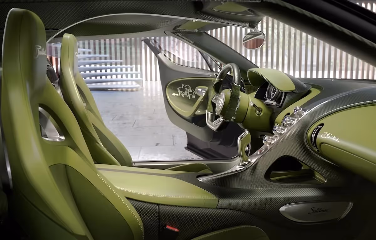 Unutrašnjost je posebna priča. Ekskluzivnim enterijerom dominira tema konja, dok se u pogledu boja Bugatti opredelio za zeleni ton koji harmonično prati karoseriju. Dizajn je futuristički, sa vertikalnim komandama na centralnom delu. Prostor ispred suvozača dekorisan je natpisom Brouillard.