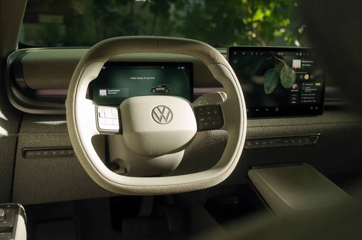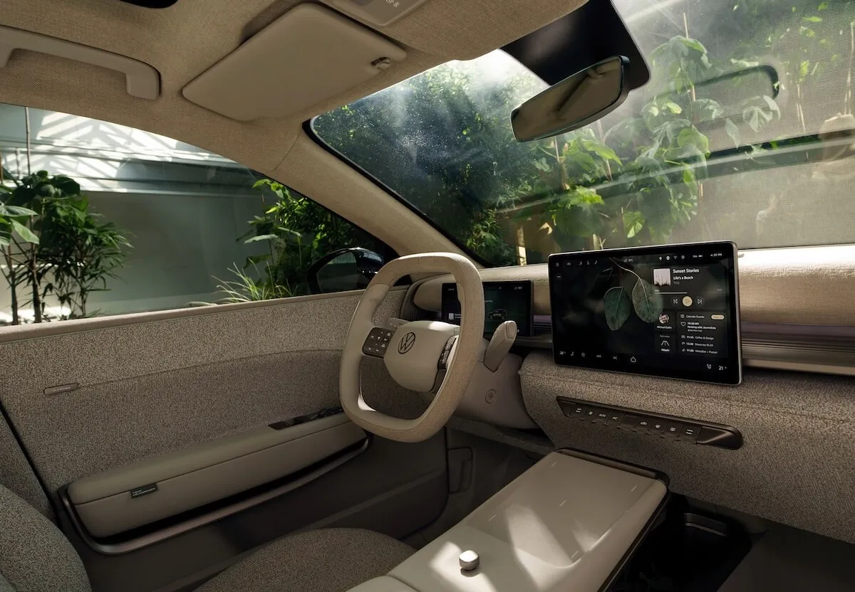 Kabina je takođe proizvod aktuelnih tendencija, uz podatak da se VW primetno distancirao od sjajne plastike trenutnih ID modela. Njih menja tkanina koja enterijeru daje svetliji i luksuzniji izgled. Instrument tabla je svedena na jednu horizontalnu traku koja se proteže širinom automobila, a prekidaju je samo dva digitalna ekrana: od 28 i 33 cm. Fizičke kontrole su svedene na mali red komandi osetljivih na dodir za kontrolu klimatizacije.